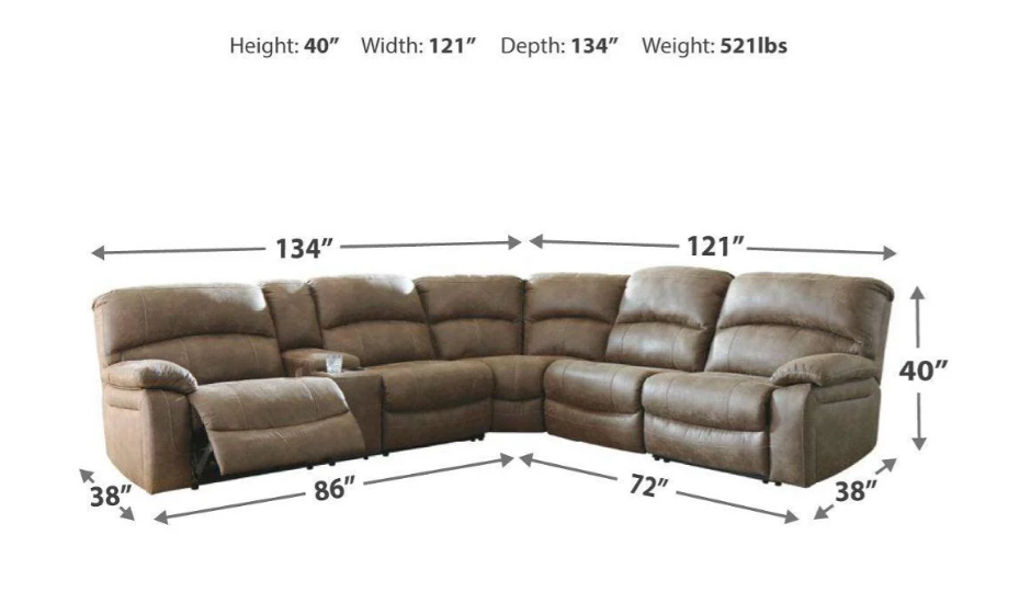• Includes 4 pieces: left-arm facing power reclining sofa with console, armless chair with fold down table, right-arm facing zero wall power recliner and wedge