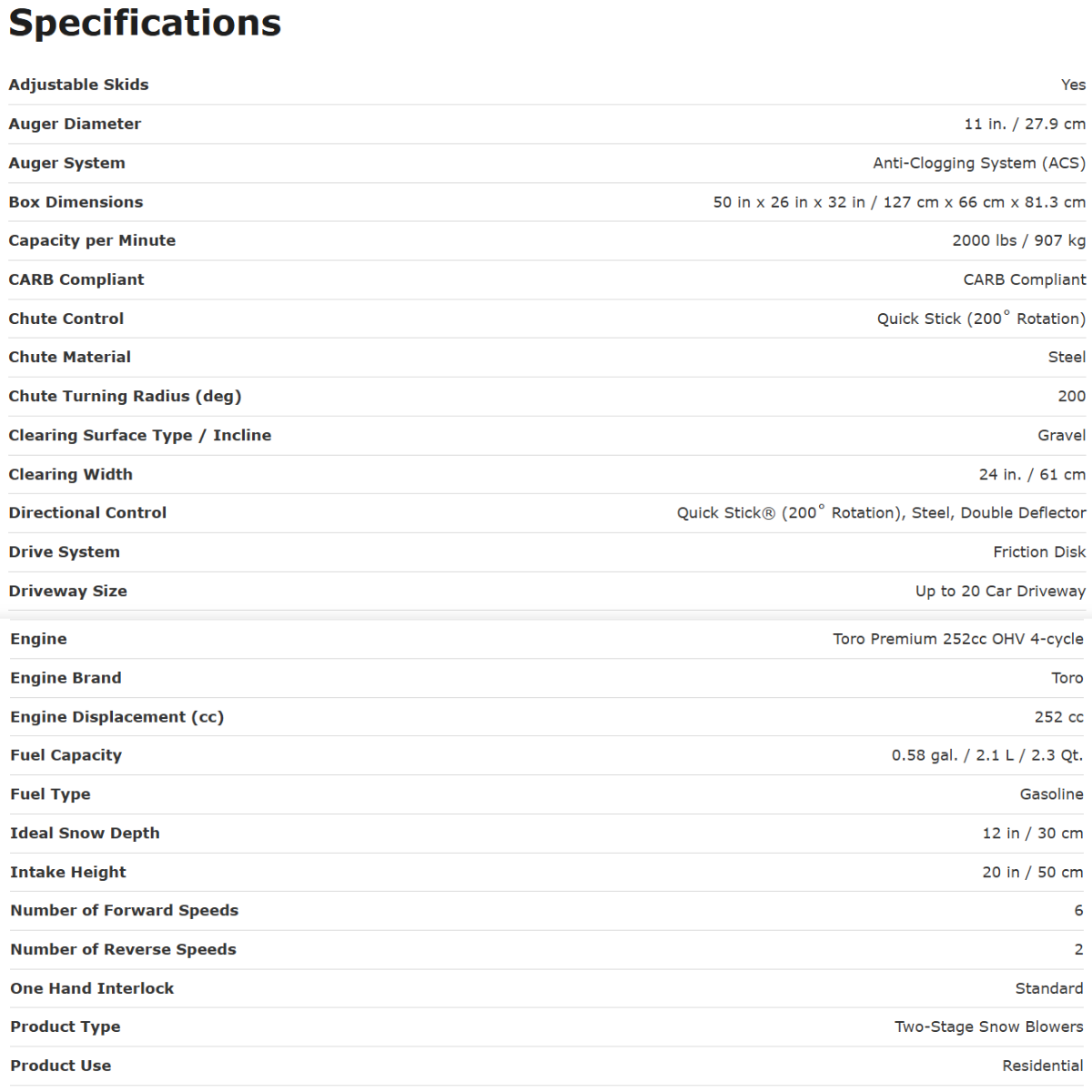 Winter's biggest snowfalls are no match for the self-propelled Power Max® 824 OE Snow Blower. With a 252cc Toro Premium 4-cycle OHV engine leading the charge, you'll muscle through the toughest snow and ice Mother Nature has to offer. And you'll be back inside for dinner before your neighbors, too, thanks to a 24 in. wide clearing width and 20 in. intake height that make quick work of even the deepest snow. The innovative Quick Stick® control allows you to change the steel chute direction and chute deflector with a single, smooth motion. Convenient one-hand operation levers allow single-handed use, freeing the other hand to change speeds or the chute control without stopping. The exclusive Anti-Clogging System monitors snow intake to reduce clogging and maximize clearing efficiency. The blower is also equipped with Hardened Gears™ in your auger gearbox - there are no shear pins to replace. Instead, if the auger hits hard material, the engine will purposely stall to prevent damage. Ideal for concrete, asphalt and gravel surfaces. And with Toro's 3-year limited warranty, you can rest easy knowing that you're prepared for anything winter has in store. Count on it.