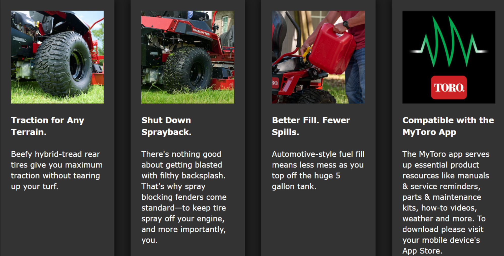 When it comes to your yard, second best just won't cut it. That's why the Toro TimeCutter® MAX is designed to take down grass like a pro and leave you feeling like a million bucks when you're done. With features like an unflinching heavy duty IronForged® deck and fully floating MyRIDE® Suspension, you get the toughness and precision that comes with over a century of pro-level engineering and a shockingly smooth, back-saving ride and save a ridiculous amount of time cutting.