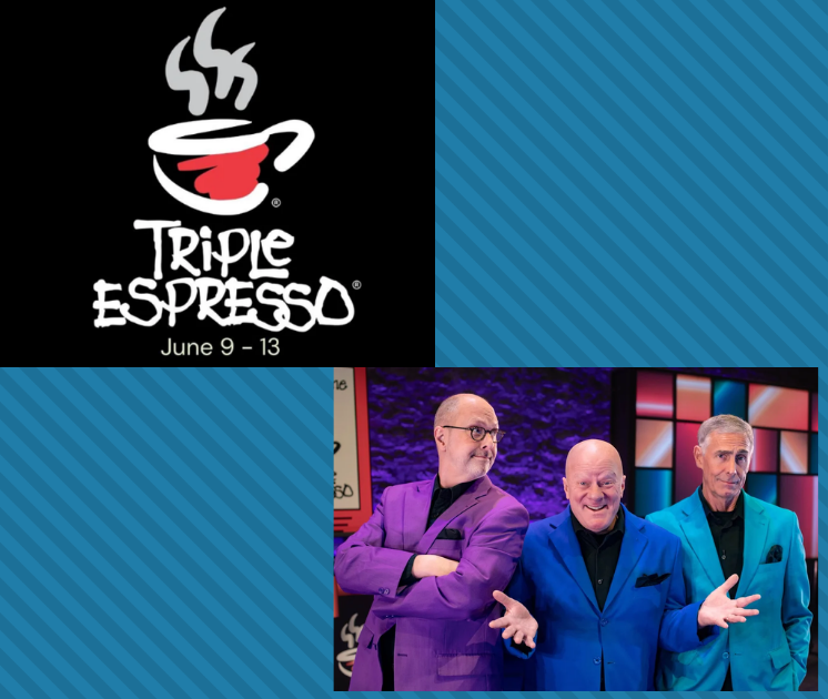 Triple Espresso tells the uproarious story of three hapless showbiz partners — Hugh Butternut, Buzz Maxwell, and Bobby Bean — whose big break ends in a spectacular four-minute disaster on national TV. Years later, the trio reunites to tell their side of the story in a whirlwind of comedy, magic, music, and heart. See it at Theatre L'Homme Dieu June 9-13 2026.